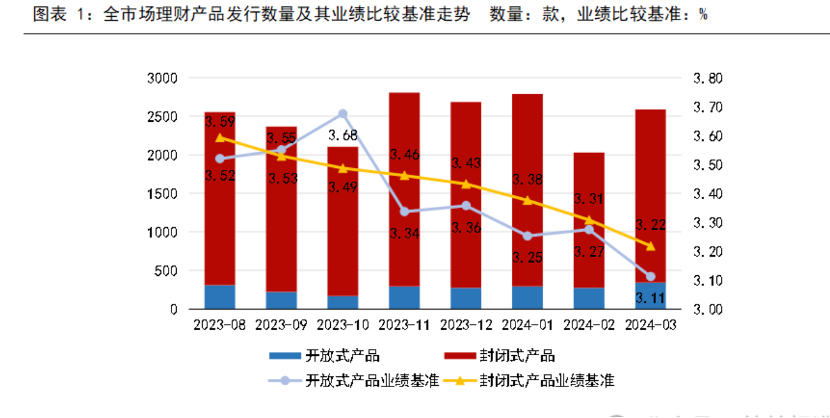 事实上,功绩相比基准走低趋势从3月就已启动。笔据普益模范数据,2024年3月,全商场共新发2587款答理居品,环比增多559款,其中342款为通达式居品,平均功绩相比基准为3.11%,环比下落0.16个百分点;2245款为闭塞式居品,平均功绩相比基准为3.22%,环比下落0.09个百分点。拉长本事线看,从2023年10月启动,通达式居品、闭塞式居品的功绩基准就启动捏续走低。